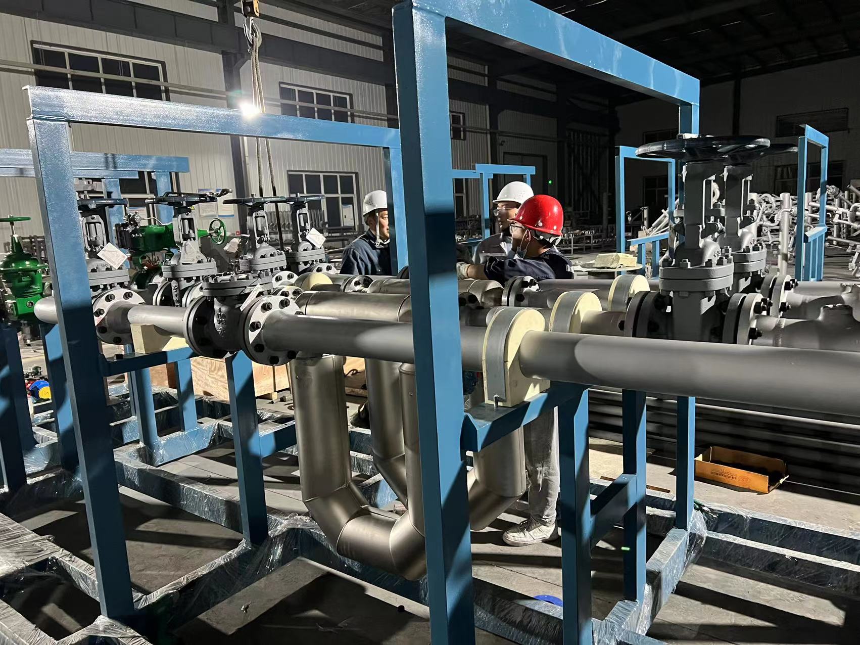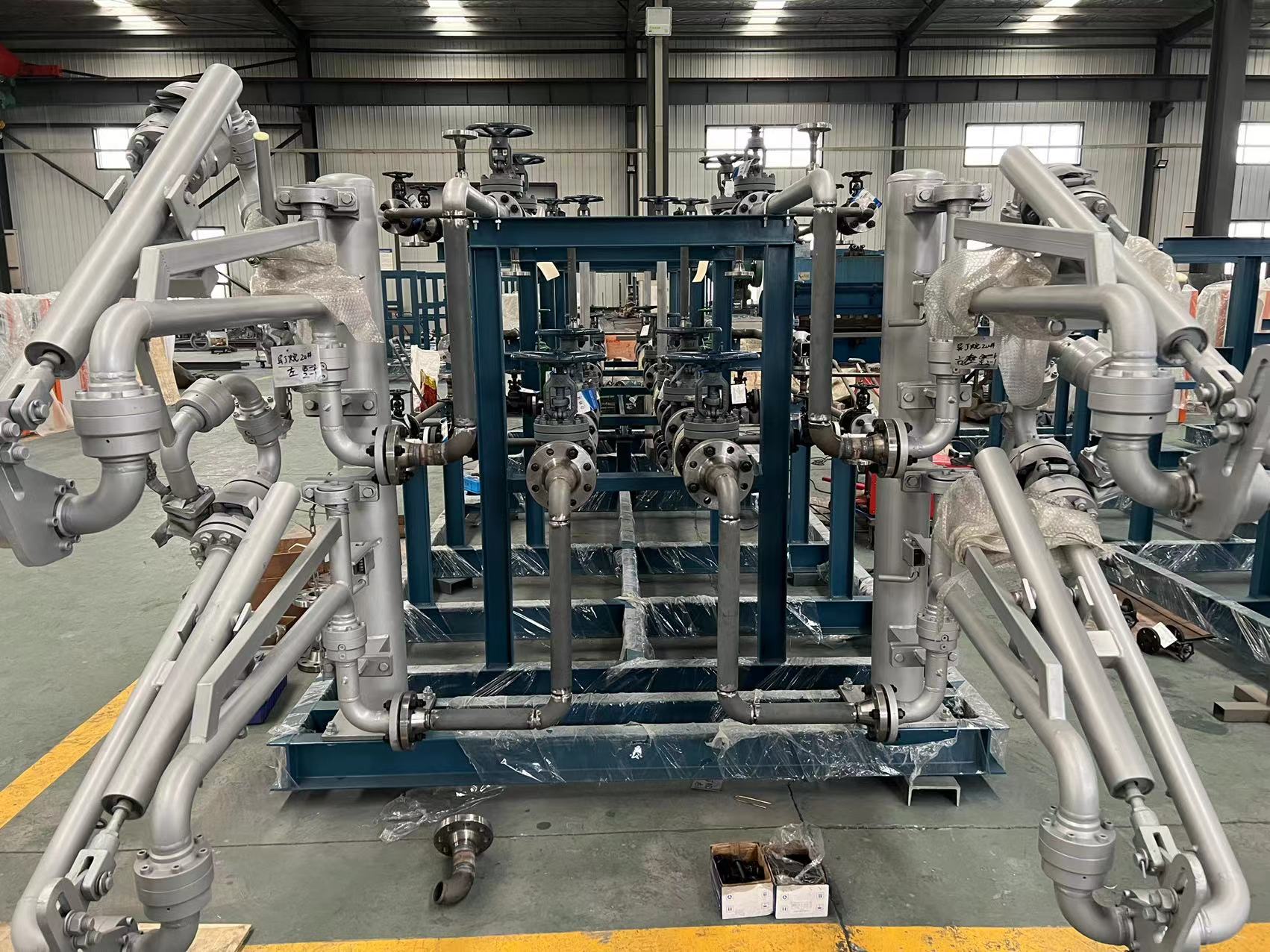 液化烴類介質(zhì)槽車裝車系統(tǒng)比油品槽車裝車系統(tǒng)復(fù)雜,現(xiàn)場(chǎng)組配裝車系統(tǒng),安裝和調(diào)試周期長(zhǎng),質(zhì)量不穩(wěn)定。為克服以上缺點(diǎn),在工廠內(nèi),將裝車系統(tǒng)的儀表和設(shè)備集成在一個(gè)橇裝架上,并完成電氣安裝、強(qiáng)度試驗(yàn)和低溫測(cè)試等,裝車橇到達(dá)用戶裝車現(xiàn)場(chǎng)后,接地角螺栓,連接工藝管線、通訊和供電線路就可以使用。結(jié)合液化烴類介質(zhì)裝車橇技術(shù)特點(diǎn),對(duì)液化烴裝車系統(tǒng)中的設(shè)計(jì)數(shù)據(jù)、功能要求、操作方法進(jìn)行敘述,綜合國(guó)內(nèi)裝車系統(tǒng)在使用中出現(xiàn)的問(wèn)題提出了解決辦法。以下為公司近期液化烴類裝車撬的生產(chǎn)現(xiàn)場(chǎng)。